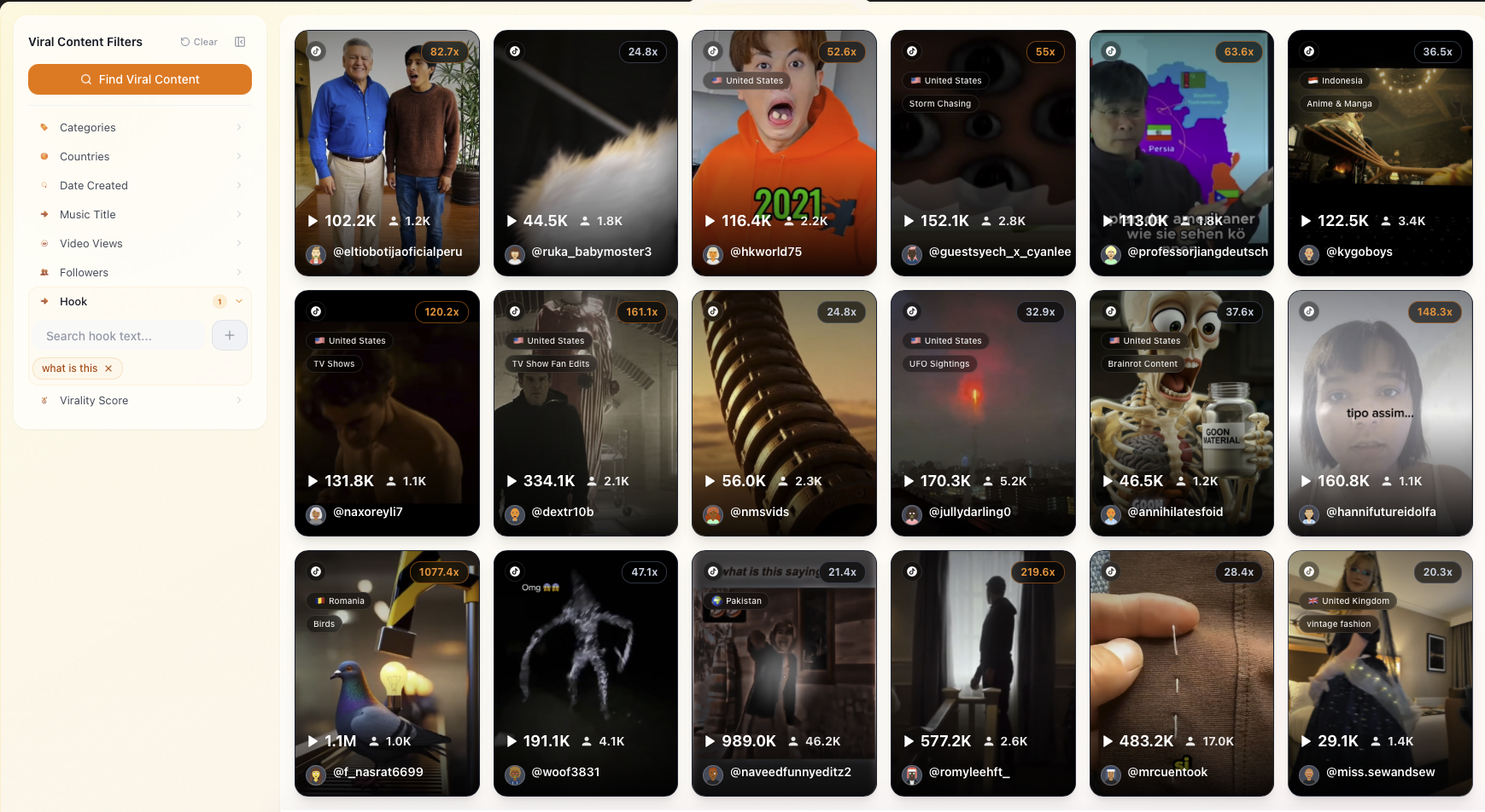 Scrapers identify accounts going viral right now. Get instant access to trending hooks and success patterns as they emerge.